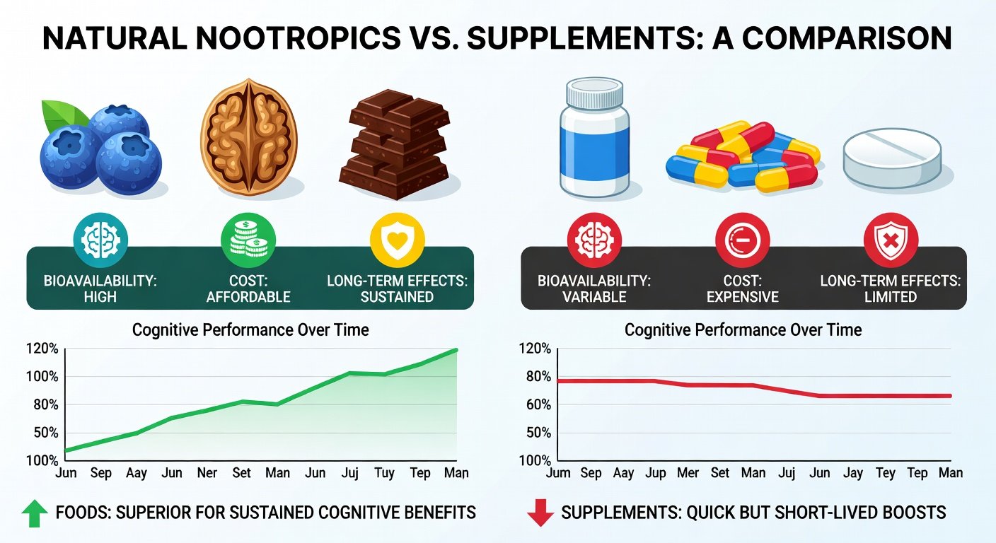 2026 research confirms natural nootropic foods outperform supplements in bioavailability, longevity, and value, but combining unlocks peak cognition. Prioritize whole foods for memory, focus, and brain health—your wallet and neurons will thank you.