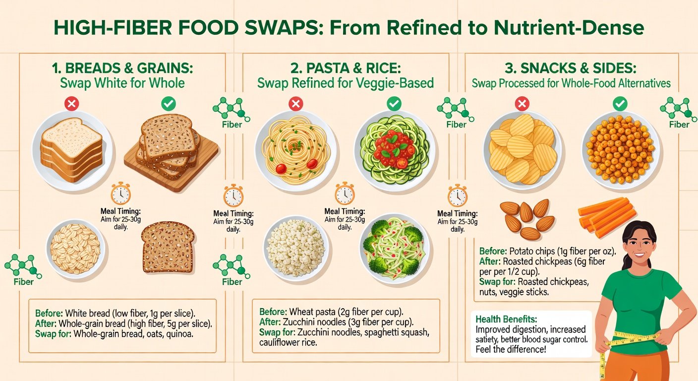 Fiber is your weight loss ally, slowing digestion and stabilizing hunger hormones. Practical swaps include:
